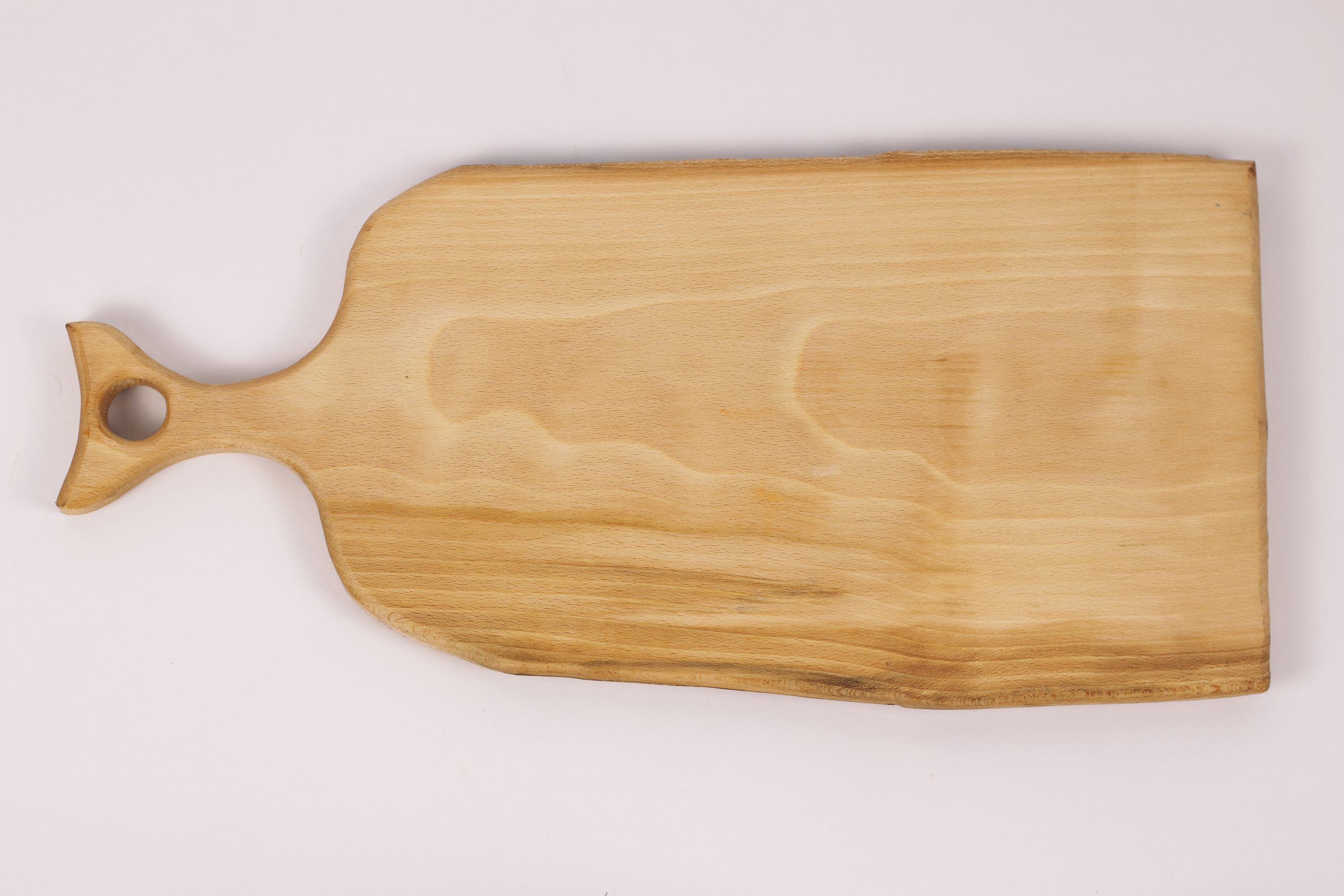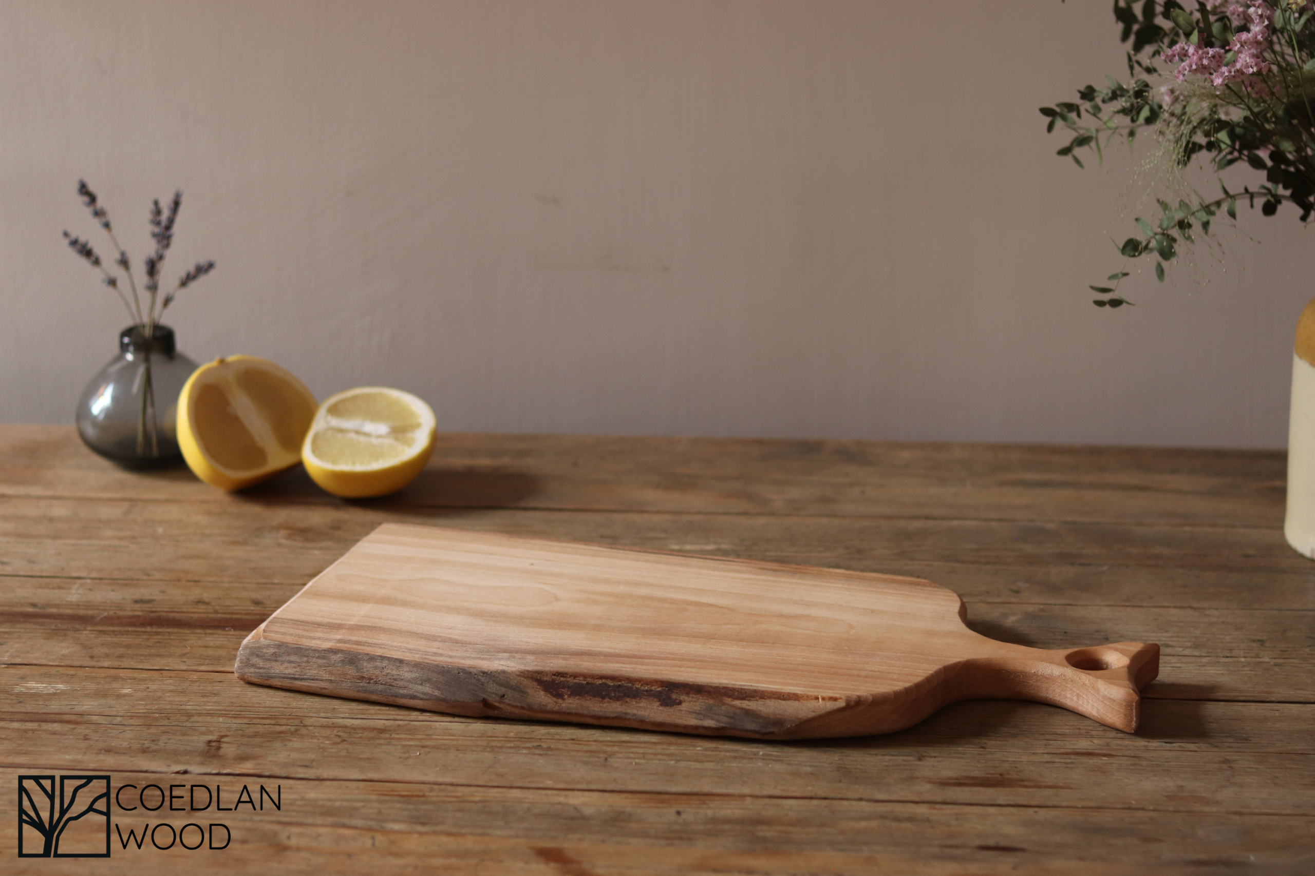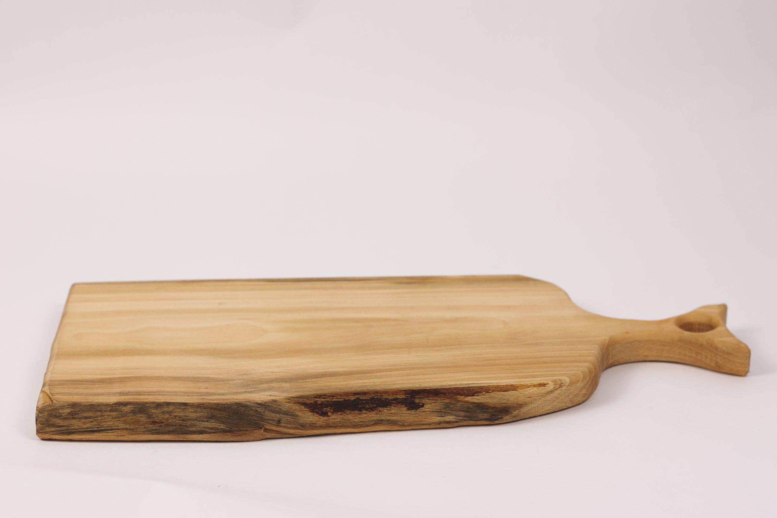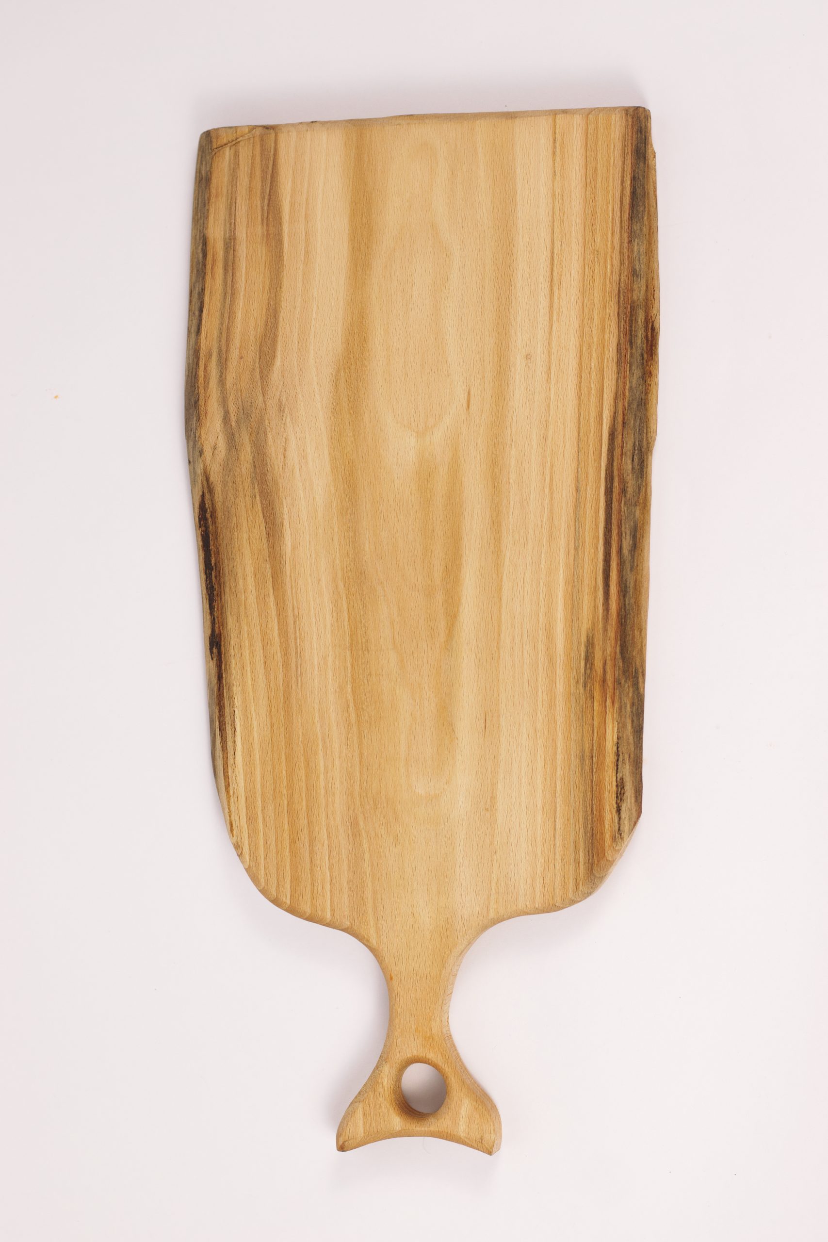 A small beech live edge chopping board with a handle. Hand-selected for its unique character, this one-of-a-kind piece is perfect for preparing or serving food.