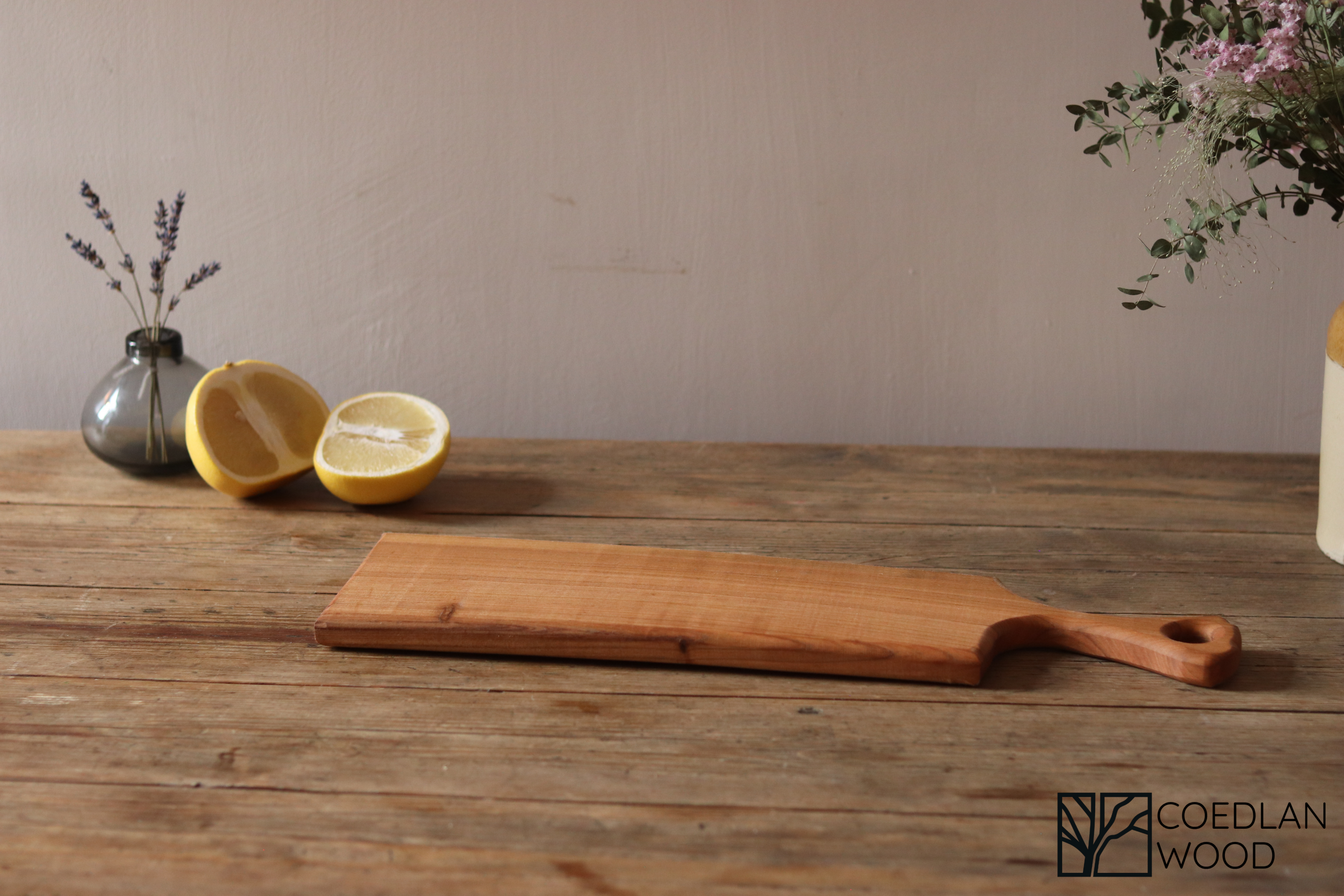 A small cherry chopping board with a handle. Hand-selected for its unique character, this one-of-a-kind piece is perfect for preparing or serving food.