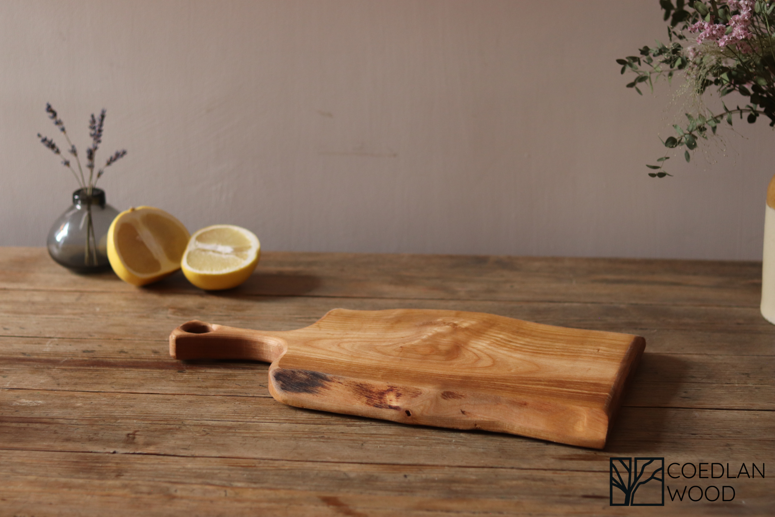 A small cherry live edge chopping board with a handle. Hand-selected for its unique character, this one-of-a-kind piece is perfect for preparing or serving food.